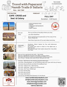 A Must-Do Bucket List Experience: Sandwich Harbour Full-Day Tour Iconic Scenery | Photographers’ Dream | Birdwatchers’ Paradise Duration: Full Day (08:30 – ±16:00) Departs from: Swakopmund Operated by: Paparazzi Namib Trails and Safaris & Where 2 Go Namibia This unforgettable tour to Sandwich Harbour is an absolute must-do on any Namibian holiday, where the towering dunes of the Namib Desert meet the wild Atlantic Ocean in one of Africa’s most surreal and iconic landscapes. Your Day...